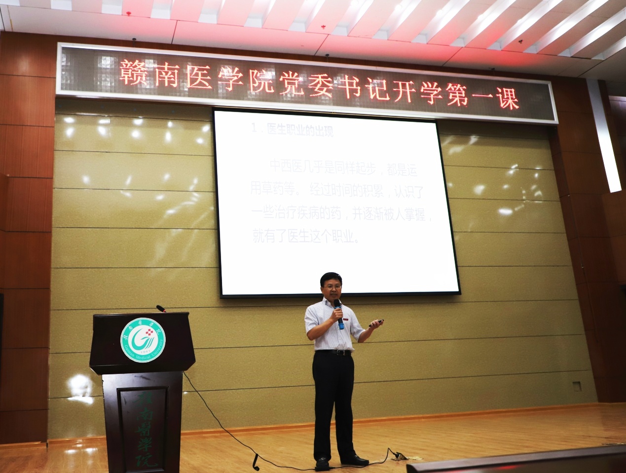 9月19日上午,黄金校区图书馆报告厅内座无虚席、气氛热烈,学校党委书记李恭进以《医史的启示》为题在这里上了一堂别开生面的开学第一课。学校领导曾泽鑫、黄瑞忠、肖树辉和相关部门负责人、师生代表等300余人到场聆听。