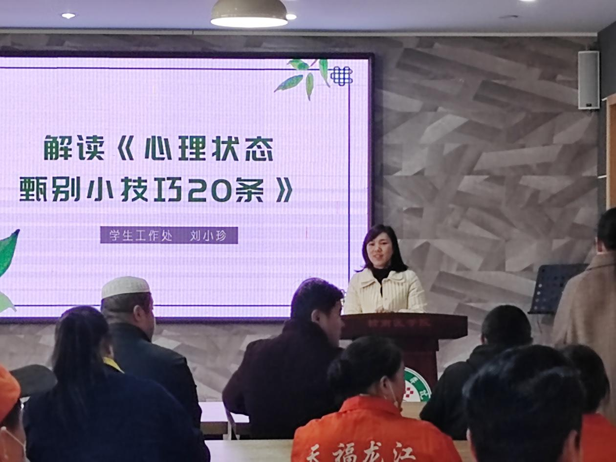 3月13日下午,我校心理咨询中心教师刘小珍在黄金校区服务楼三楼路演厅开展了主题为“学生心理状态甄别技巧”的讲座,学校60余名后勤、宿管人员参加培训。