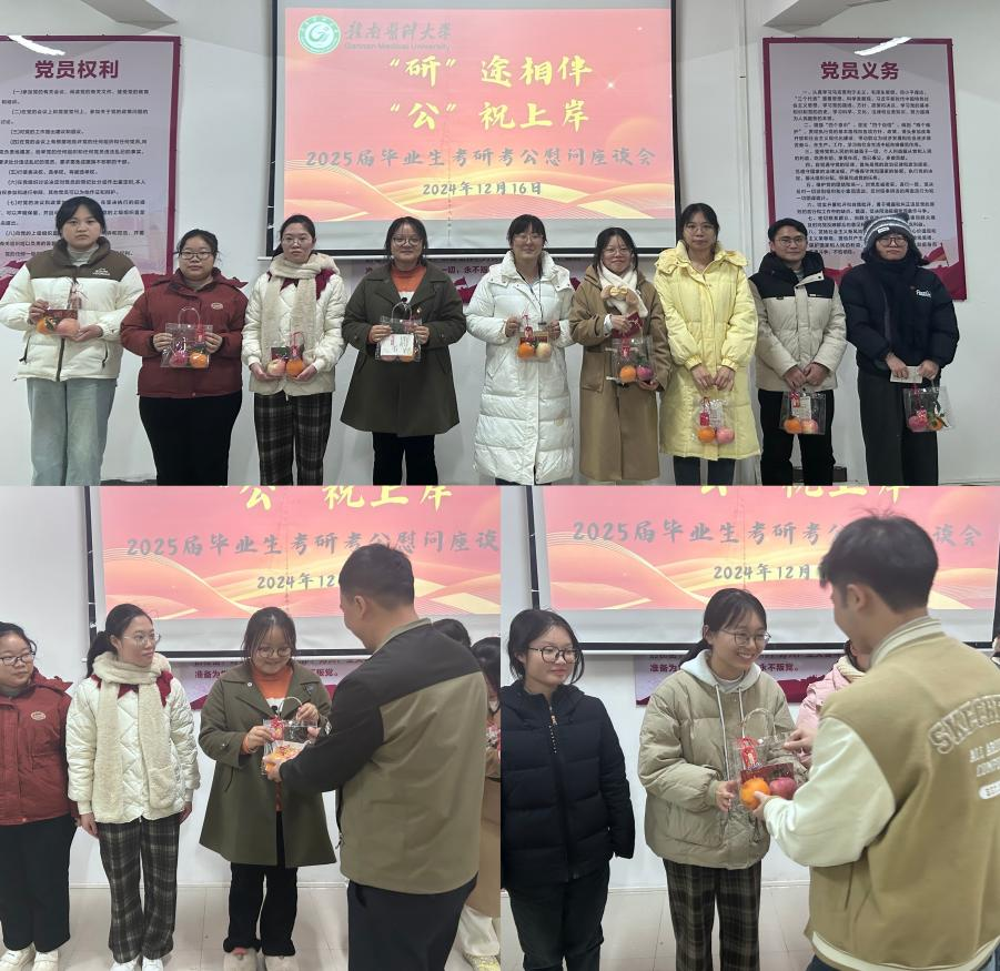 为帮助考研考公学子增强备考信心,进一步做好考前心理压力调适工作,12月16日晚,药学院在学生宿舍五六栋党员活动室举行2025届毕业生考研考公慰问座谈会,学工办辅导员及20余名考研考公学生代表参加。