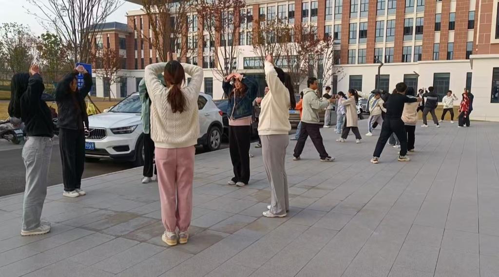 康复学院学生晚自习课间通过练习八段锦放松身心