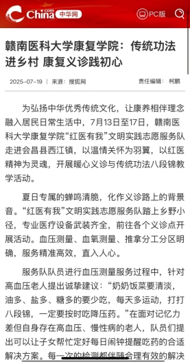 通过红色教育浸润、专业服务落地、基层实践赋能的创新方式,循着红色足迹,扎根赣南红土,以专业所长践行“红医精神”。通过探索“红色文化”与“康复专业”的深度融合,将社会实践转化为一堂“行走的思政课”和“移动的专业课”,将康复服务延伸到老区基层,用康复知识服务人民健康,实现学以致用,唱响“红医精神铸魂育人”主旋律。