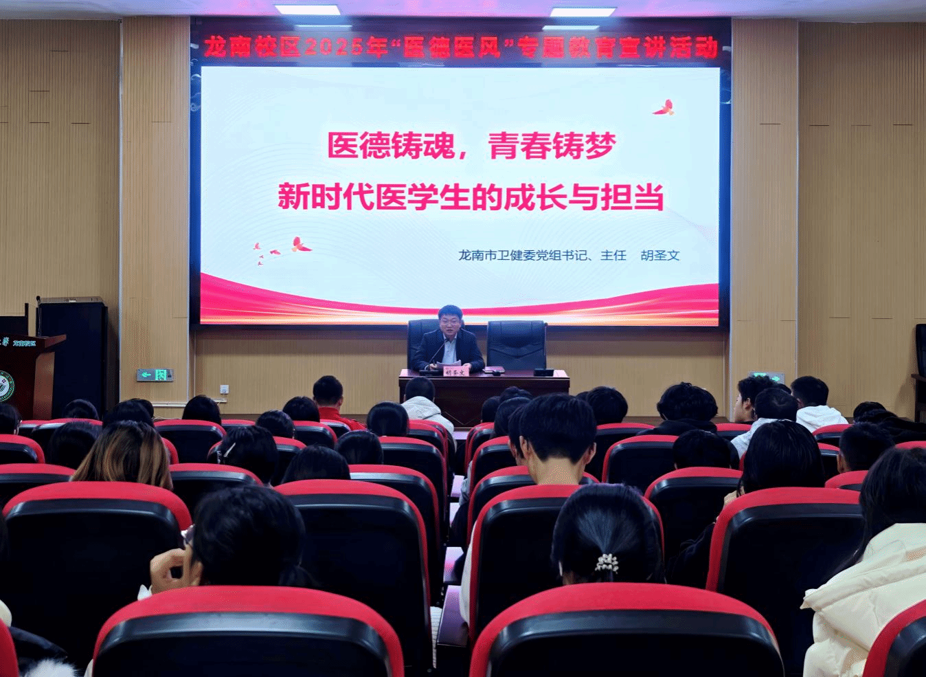 医德铸魂守初心,红医传薪担使命。为深化“红医魂”党建品牌育人实效,筑牢医学生职业初心,11月25日,龙南校区邀请学校2001级校友、龙南市卫健委党组书记、主任胡圣文开展2025年“医德医风”专题教育宣讲活动。龙南校区辅导员,临床医学、口腔医学等专业160余名师生齐聚现场,共赴一场医德铸魂的精神盛宴。