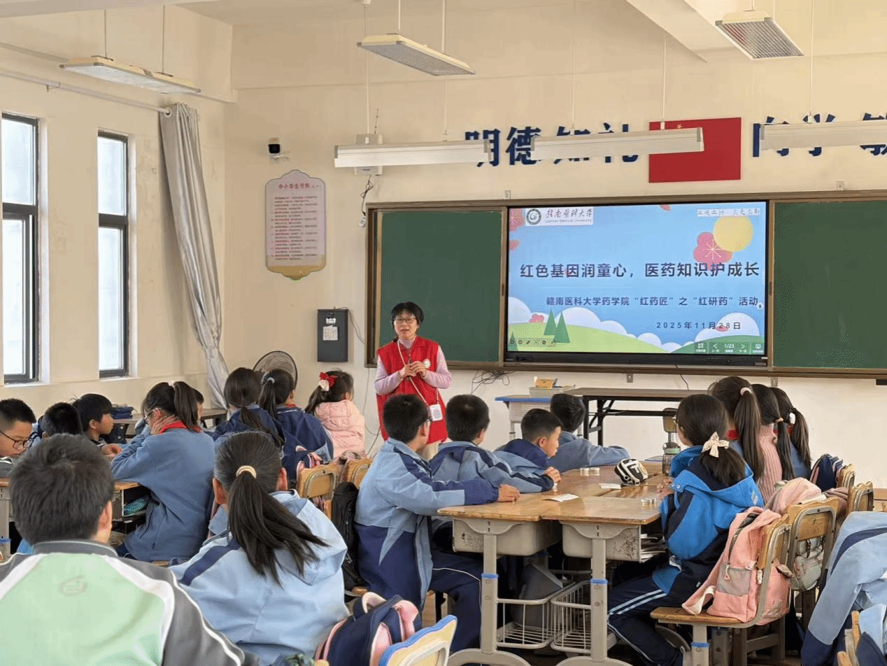 11月28日,药学院教工第六党支部联合学生党支部,组建“红药匠”师生党员志愿者走进赣南师范大学蓉江附属小学,开展“红色基因润童心,医药知识护成长”主题志愿服务活动,用红色故事铸魂,以医药技艺赋能,为孩子们带来了一场兼具思想温度与科学趣味的实践课堂,让孩子们在实践中感受“红药匠”的初心与担当,让红色种子在童心扎根,让健康理念伴成长同行。