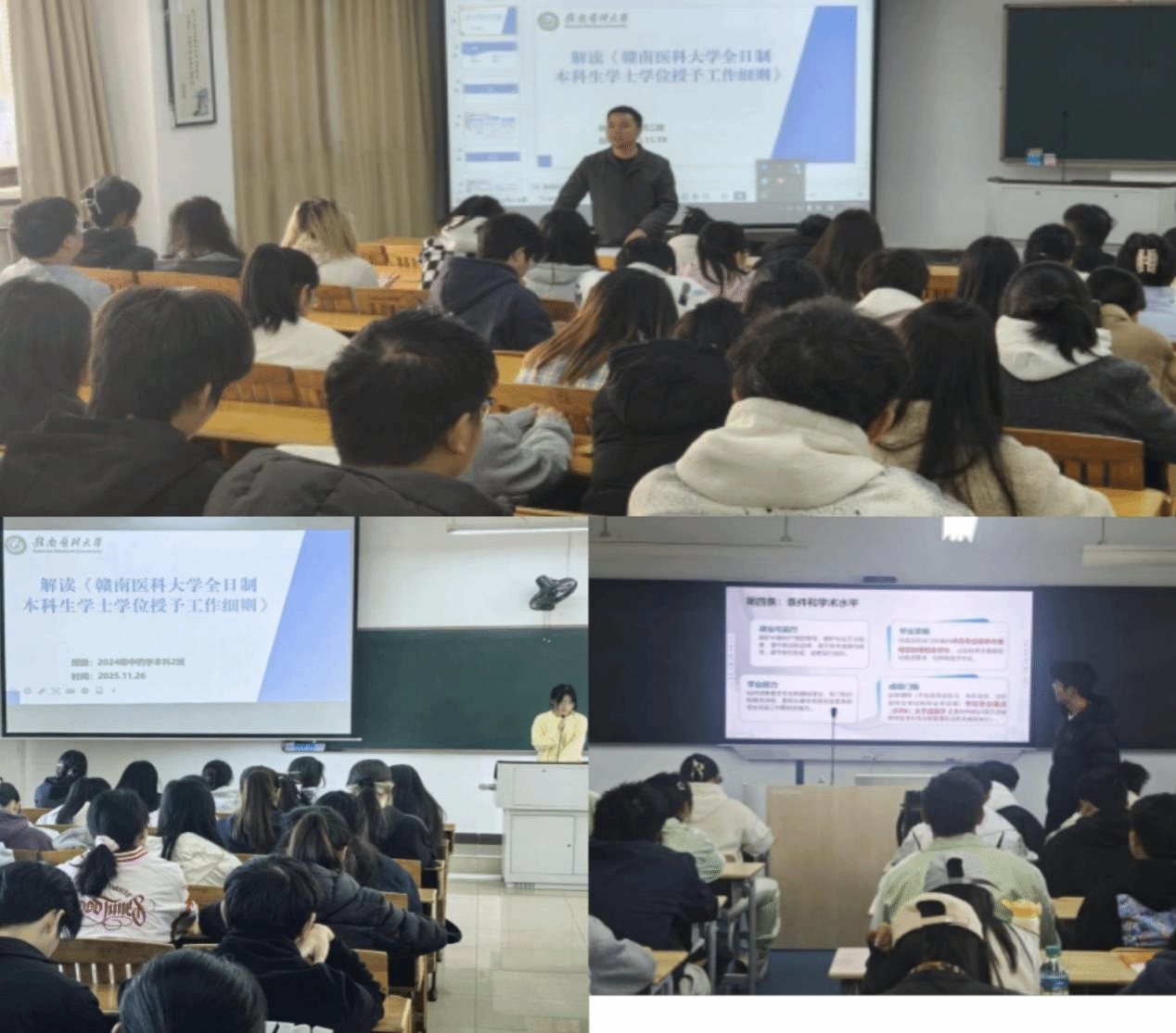 在学风建设专题环节,各班围绕《赣南医科大学全日制本科生学士学位授予工作细则》展开系统学习。班主任及学生干部对细则中的总则要求、学位授予核心依据、申报审批流程等关键条款进行精准解读,并结合“红药匠”精神倡导的“严谨求实、精益求精”治学准则,向学生阐明优良学风对成长成才的重要意义。
