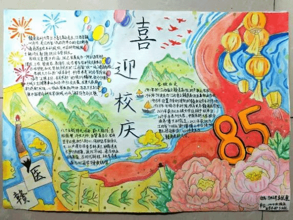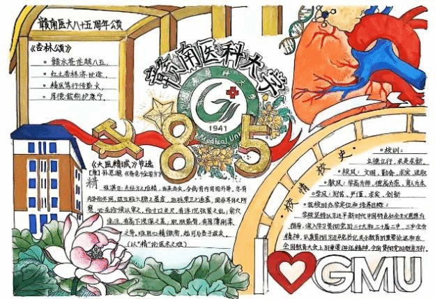 手抄报设计图文并茂、构思精巧,串联起学校85年来扎根赣南红土地、服务基层健康的奋斗历程:作品中既有赣南医科大学的校史沿革、办学特色介绍,也有“喜迎校庆”“精医尚德,薪火八五”等主题创作,搭配校徽、莲花、山水等元素,将学校“立德立行,求是求新”的校训精神与青春朝气巧妙融合,在方寸之间绘就对母校的热爱与祝福。