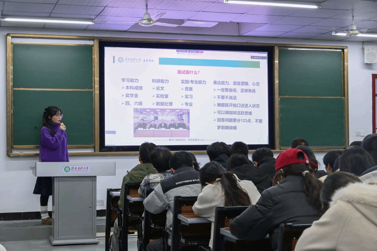 分享会上,原苗苗结合康复专业考研特点,围绕复试流程、专业知识问答、临床思维应答等内容梳理核心考点与答题逻辑;李晓娟则从自我介绍优化、英语口语表达、仪容仪表规范、临场应变技巧等方面展开分享,细致解答备考细节问题。随后,活动现场设置模拟面试环节,刘旭、郭名萃等六位研究生对同学们进行一对一实战演练,通过现场点评与即时纠正,全面提升应试能力与心理素质,有效缓解了复试焦虑,帮助同学们明确了备考方向。