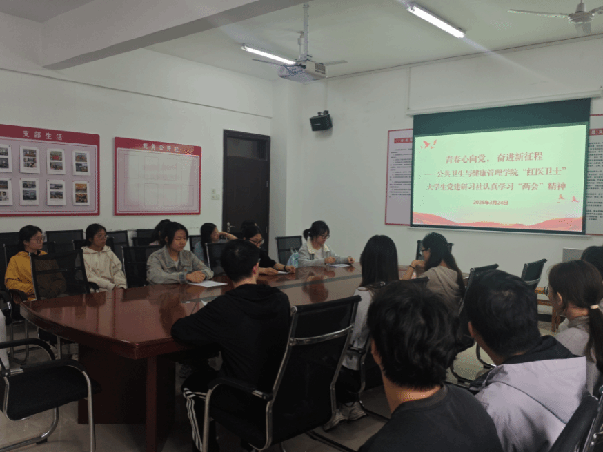 为深入学习贯彻2026年全国两会精神,准确把握国家发展大势,引导广大青年学子将专业所学与国家卫生健康事业发展紧密结合起来,3月24日,公共卫生与健康管理学院“红医卫士”大学生党建研习社认真学习2026年全国两会精神,开展交流研讨,党建研习社全体社员参加。