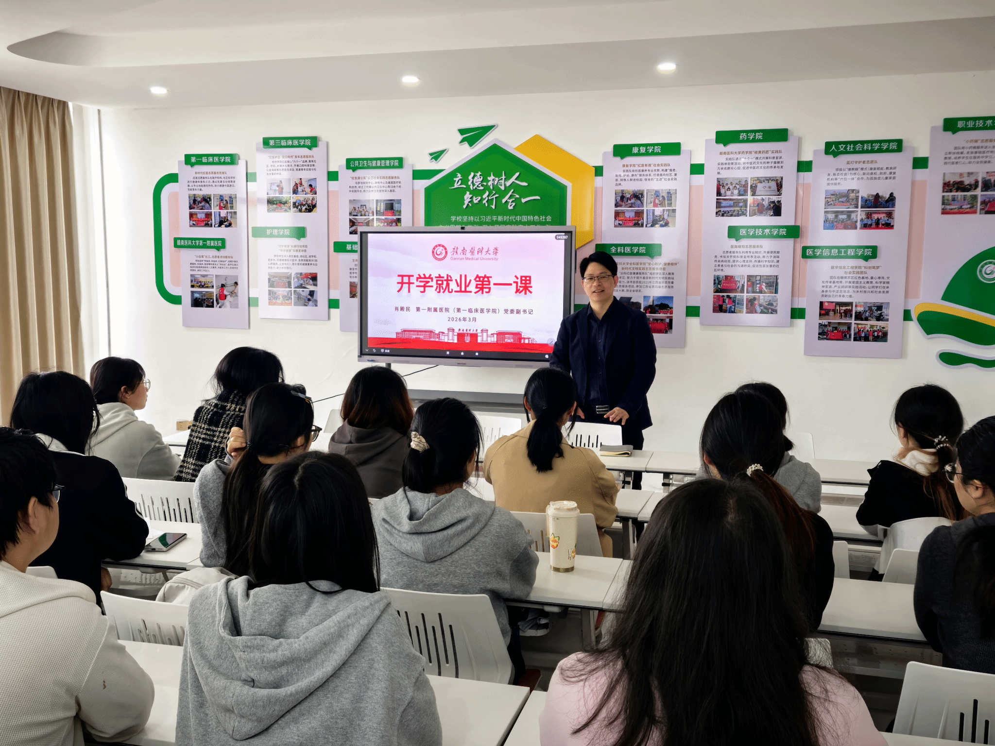 为帮助医学生明晰职业发展方向,提升就业竞争力,引导学子树立正确的成才观与就业观,近日,第一临床医学院开展了“就业第一课”主题教育活动。第一附属医院(第一临床医学院)党委副书记肖殿民担任主讲,2026届本科毕业生及全体辅导员参加了此次活动。