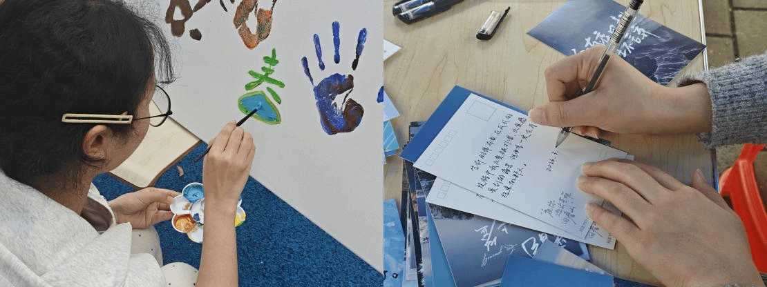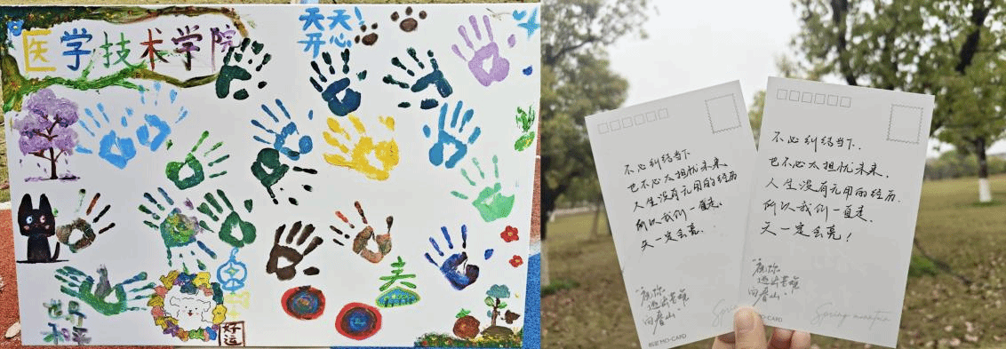 活动精心设计“绘心小语”与“掌印初心”两大互动环节。在“绘心小语”环节,同学们围绕图文素材静心创作、分享交流,将医者初心融入文字创作,在书写与倾听中实现以德育心、以智慧心;在“掌印初心”环节里,大家在画布上按下彩色手印,共同完成集体作品,每一枚掌印都凝聚着“红医技”的红色力量,传递着温暖与担当,增强了内心的归属感与凝聚力。活动现场科学划分创作区、分享区与互动区,工作人员分工协作,各环节衔接有序。