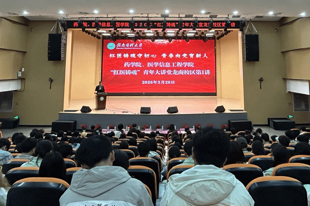3月28日上午,药学院与医学信息工程学院在龙南校区联合举办“红医铸魂守初心 青春向党育新人”2026年“红医铸魂”青年大讲堂龙南校区第一讲活动。药学院党委副书记罗丽萍与600余名师生共同参会。