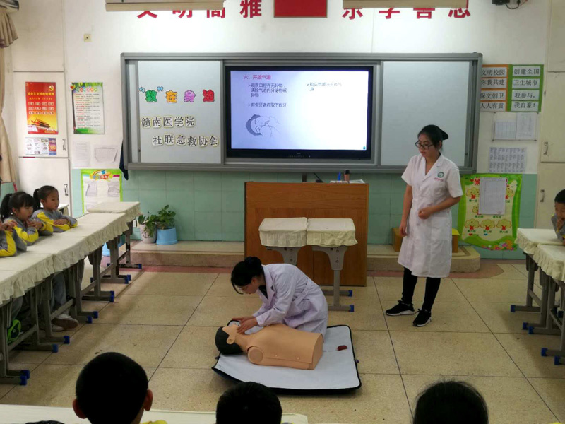 3月27日,学校社联急救协会在医学实用技能培训中心杨娟老师的带领下前往赣州市文清实验小学,在该校四年级(8)班开展心肺复苏知识与技能培训。