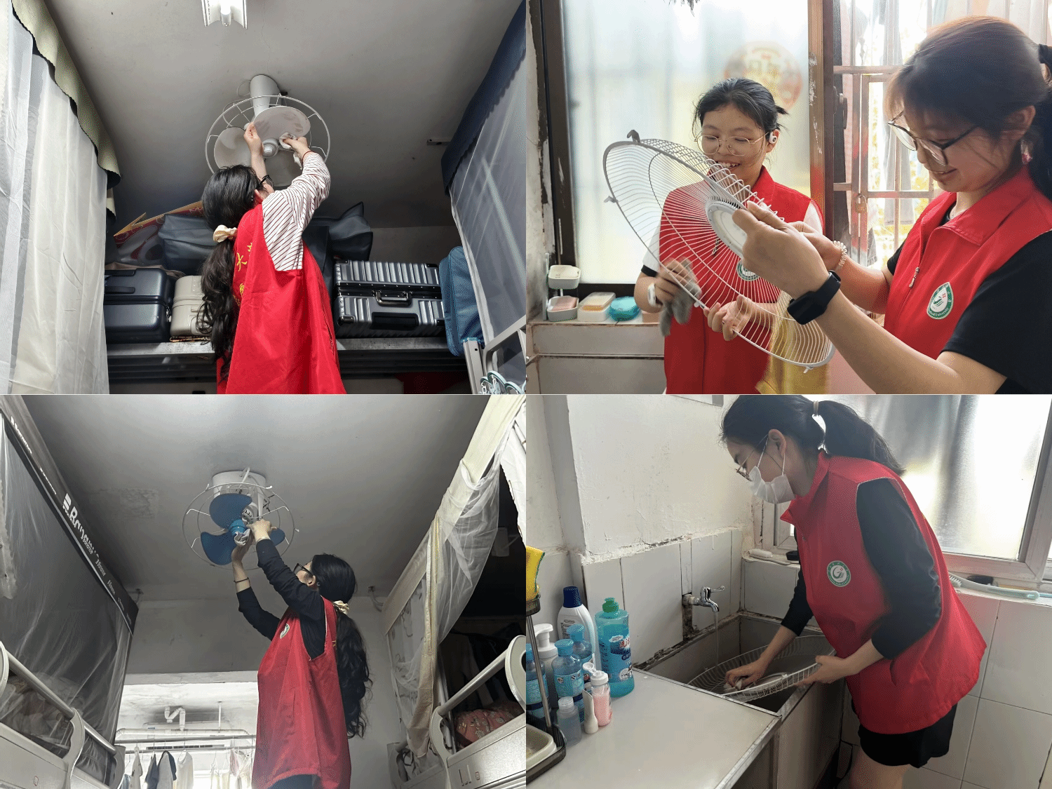 志愿者们深入药学院各学生寝室,对宿舍风扇进行全面清理,用实际行动回应同学所需。活动现场,志愿者们分工有序、配合紧密,严格遵守安全规范。面对积尘厚重的风扇,大家不怕脏累,主动承担登高拆卸、擦拭清洗、复位安装等任务,细致清除每一处死角。大家互相保护、协同作业,确保安全与效率并重。经过辛勤劳动,一台台风扇焕然一新,志愿者们用实际行动为同学们营造出清爽舒适的居住环境。
