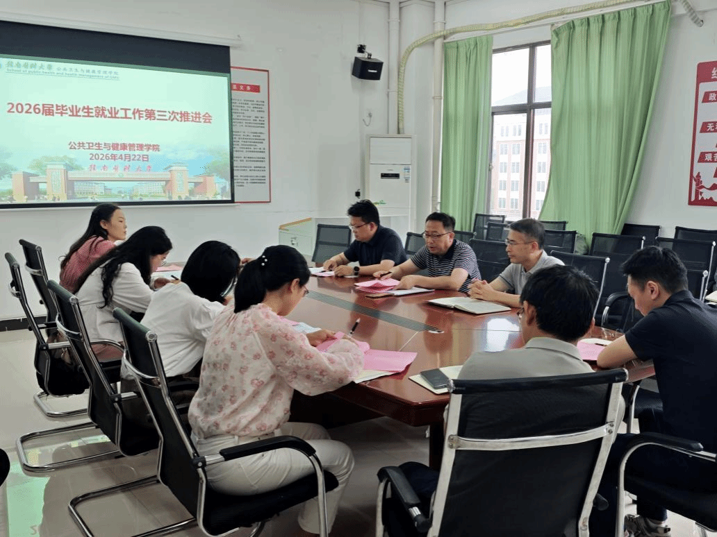 为扎实推进2026届毕业生高质量就业,4月22日,公共卫生与健康管理学院在蓉江校区召开2026届毕业生就业工作第三次推进会。学院党委书记邱伟,党委副书记、院长胡恭华,党委副书记曾发挥出席会议,各专业负责人、教研室负责人、全体班主任及辅导员等30余人参加会议,会议由曾发挥主持。