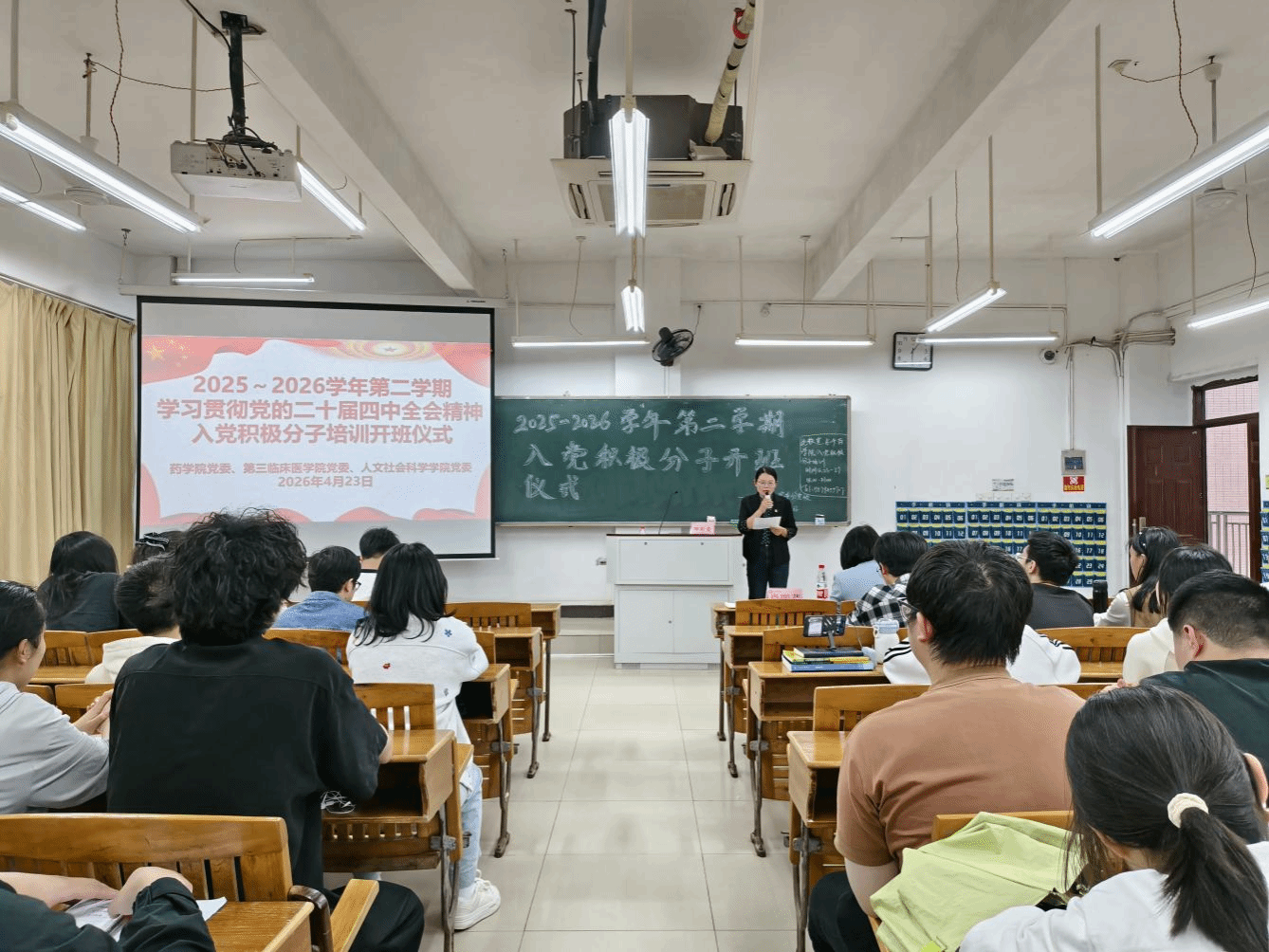 4月23日,药学院联合第三临床医学院、人文社会科学学院举行2025—2026学年学习贯彻党的二十届四中全会精神第二学期入党积极分子培训开班仪式暨培训第一讲。学院党委副书记肖丽芹、各学院学生党支部书记及200余名入党积极分子参会。