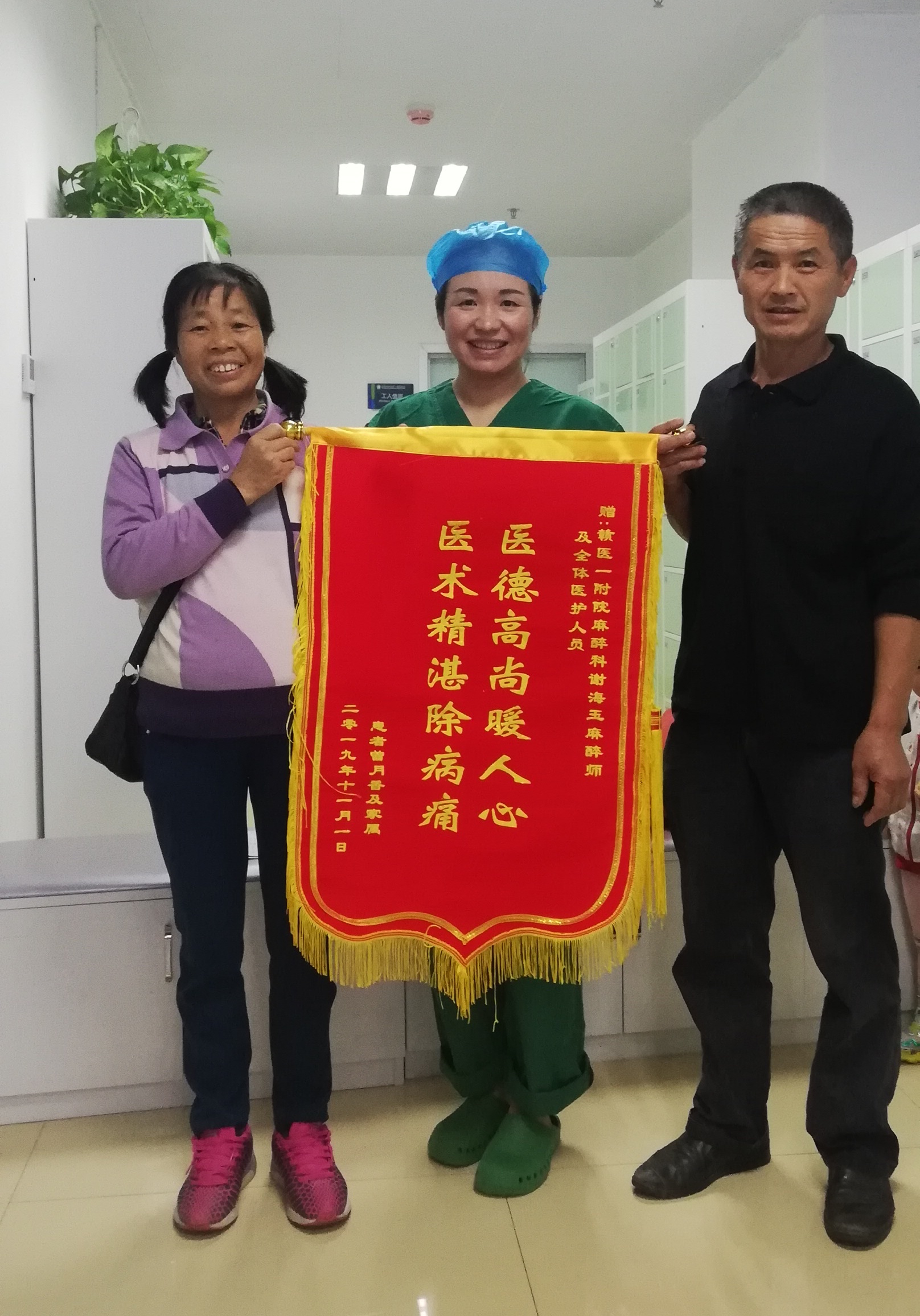 11月4日上午,秋高气爽,阳光明媚。我校一附院黄金院区麻醉科谢海玉副主任医师刚刚交完班,就收到一份特殊的礼物——一位出院病友曾女士特地送来的大红锦旗,上书“医术精湛除病痛,医德高尚暖人心”几个大字,这是她全家人的肺腑之言。