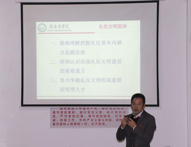 11月18日晚,基础医学院党委副书记刘志春以“弘扬传统美德,争做礼仪文明的高素质应用人才”为主题,为该院全体学生干部上礼仪文明培训课。