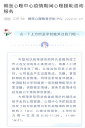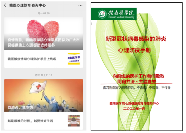 教工第二党支部发挥心理学专业技能,开展疫情期间心理健康护理知识科普宣传,全体党员参与编制了《赣南医学院新型冠状病毒感染的肺炎心理防疫手册》,为师生心理健康保驾护航。同时,开通了疫情防控期师生心理援助服务,并针对全校学生开展疫情下心理危机状况摸查,帮助师生疏导消极情绪,给予支持和希望,促进身心健康,坚定信心、同舟共济、坚决打赢疫情防控阻击战。