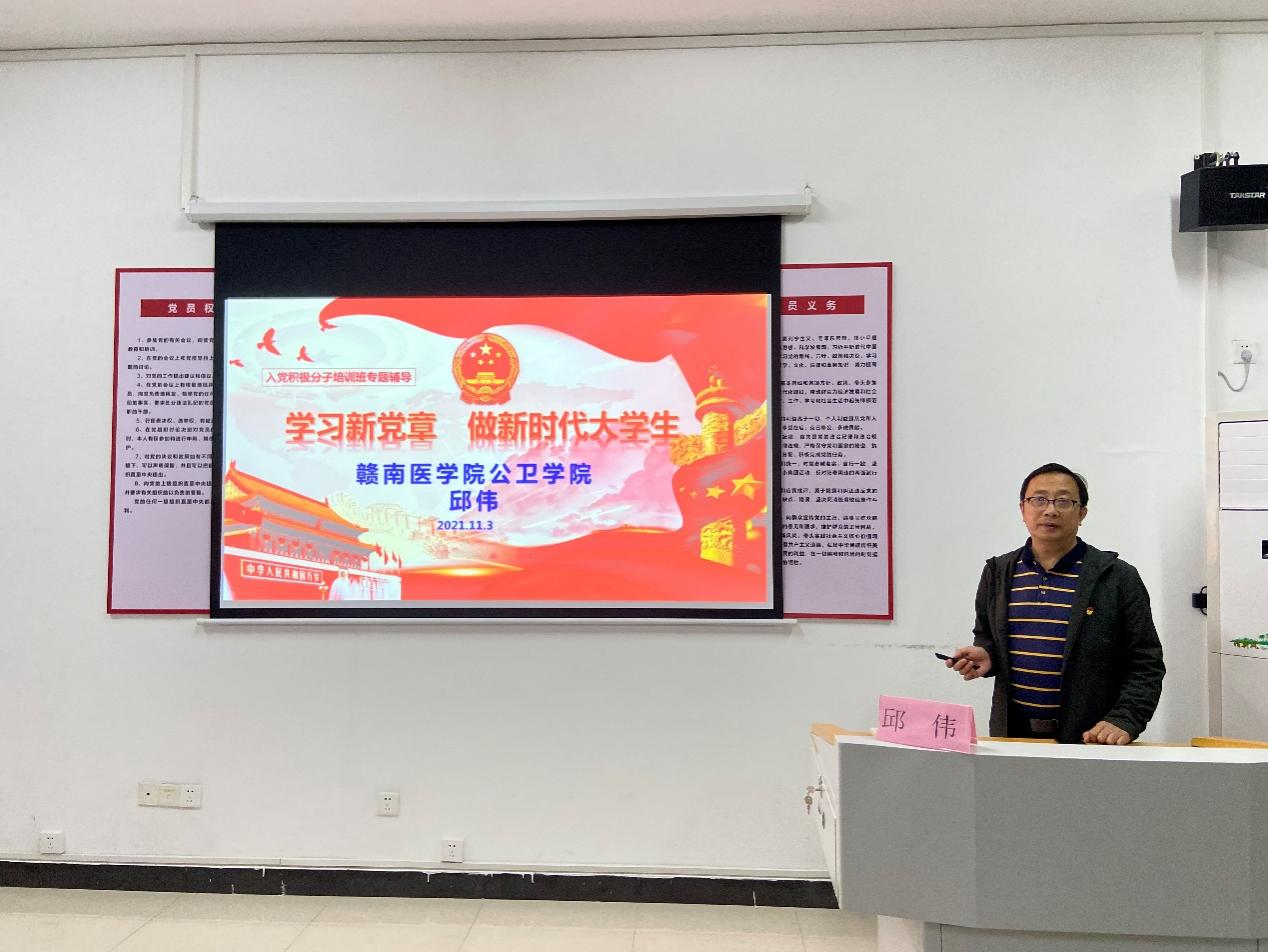 11月3日晚,公共卫生与健康管理学院党委副书记邱伟以“学习新党章,做新时代大学生”为题给入党积极分子上党课。教师代表及全体入党积极分子30余人参加。