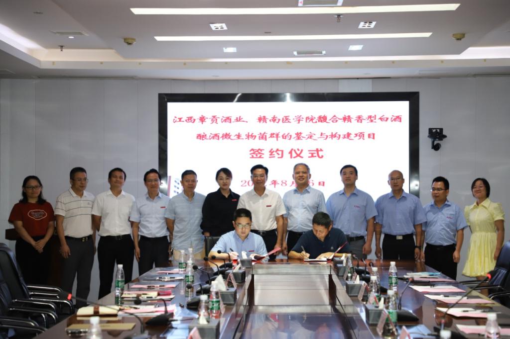 8月26日上午,我校基础医学院曾炜团队与章贡酒业合作的《馥合赣香型白酒酿酒微生物菌群的鉴定与构建》项目签约仪式在黄金校区举办。学校党委副书记曾泽鑫、科研处、基础医学院相关负责人、曾炜团队成员以及江西章贡酒业有限公司副总经理、高级工程师万华荣,副总经理助理、中国白酒国家评委廖志勇等10位相关技术骨干参加仪式。