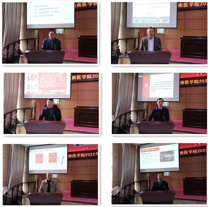 李恭进强调,党的基层组织建设要围绕捍卫“两个确立”展开。要加强政治建设,增强“四个意识”、坚定“四个自信”、做到“两个维护”,确保学校在思想上政治上行动上同以习近平同志为核心的党中央保持高度一致;要强化思想理论武装,持续深入学习贯彻党的二十大精神,坚持不懈学好用好习近平新时代中国特色社会主义思想,并用以武装头脑、指导实践、推动工作。党的基层组织建设要紧盯立德树人根本任务布局。要夯实课堂思政主阵地,深入开展立德树人教育和思想政治工作;要把牢意识形态主战场,管好意识形态阵地,坚决抵御外部势力渗透;要扎实落实“三个文明”主任务,培养德技并重的医学人才;要培育红医文化主品牌,教育引导广大师生学习践行红医精神;要强化师德师风建设主抓手,自觉做学生为学、为事、为人的模范。党的基层组织建设要锚住“五大工程”发力。要紧盯“五大工程”建设,内强素质、外谋合作,补齐补强自身短板弱项,走出去开阔眼界、谋求合作,重点在更名大学、学科建设、特色培养、校园环境改善上下功夫,推动学校各项工作提质量、创特色、上水平。党的基层组织建设要在全面从严治党上见成效。要坚决落实全面从严治党主体责任,加强基层组织和党员干部队伍建设,配强党支部书记尤其是“双带头人”;要狠抓作风建设和师德师风、医德医风建设,持续整治形式主义、官僚主义,关心职工生活和学生成长,解决实际问题;要健全反腐倡廉体制机制,一体推进不敢腐、不能腐、不想腐,保持学校良好的政治生态。
