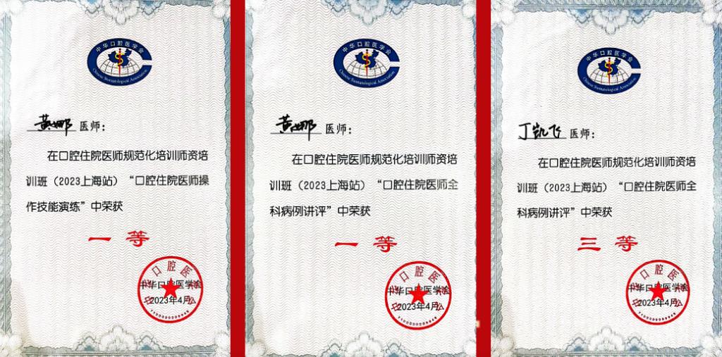 3月30-4月1日,由中华口腔医学会、中国医师协会主办的2023年全国住院医师规范化培训师资培训班在上海举行,我校口腔医学全科规培基地学员黄娜在“全科病例讲评”及“操作技能演练”技能赛中荣获一等奖,丁凯飞在“全科病例讲评”中荣获三等奖。