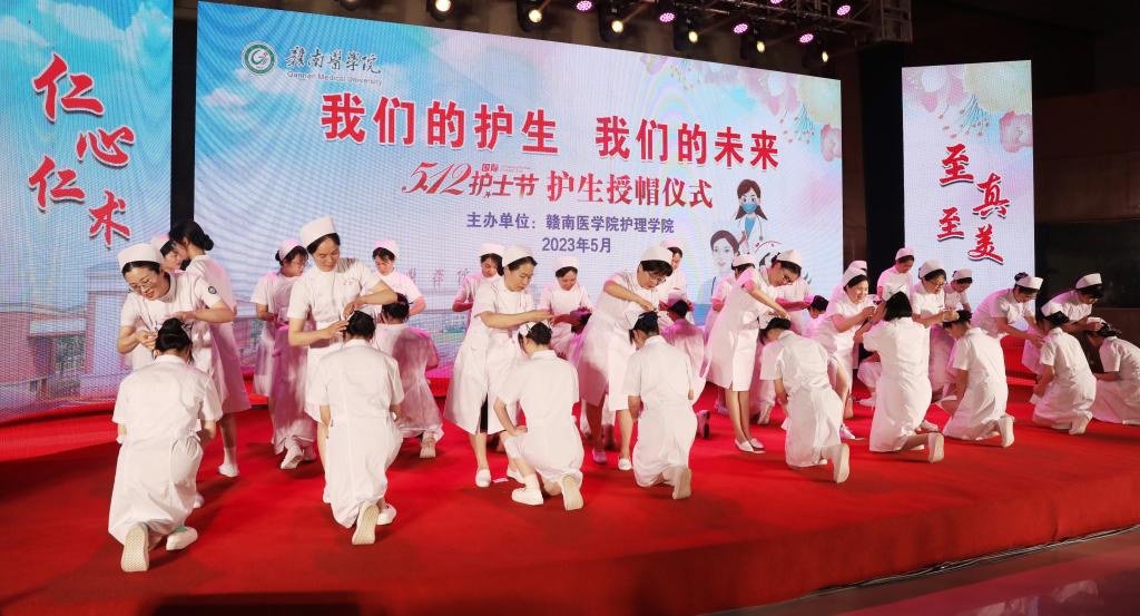 5月11日晚,护理学院在黄金校区举行“我们的护生,我们的未来”护生授帽暨护士节系列活动颁奖仪式。该院领导班子全体成员,一附院优秀护理前辈代表及2022级全体护生参会。