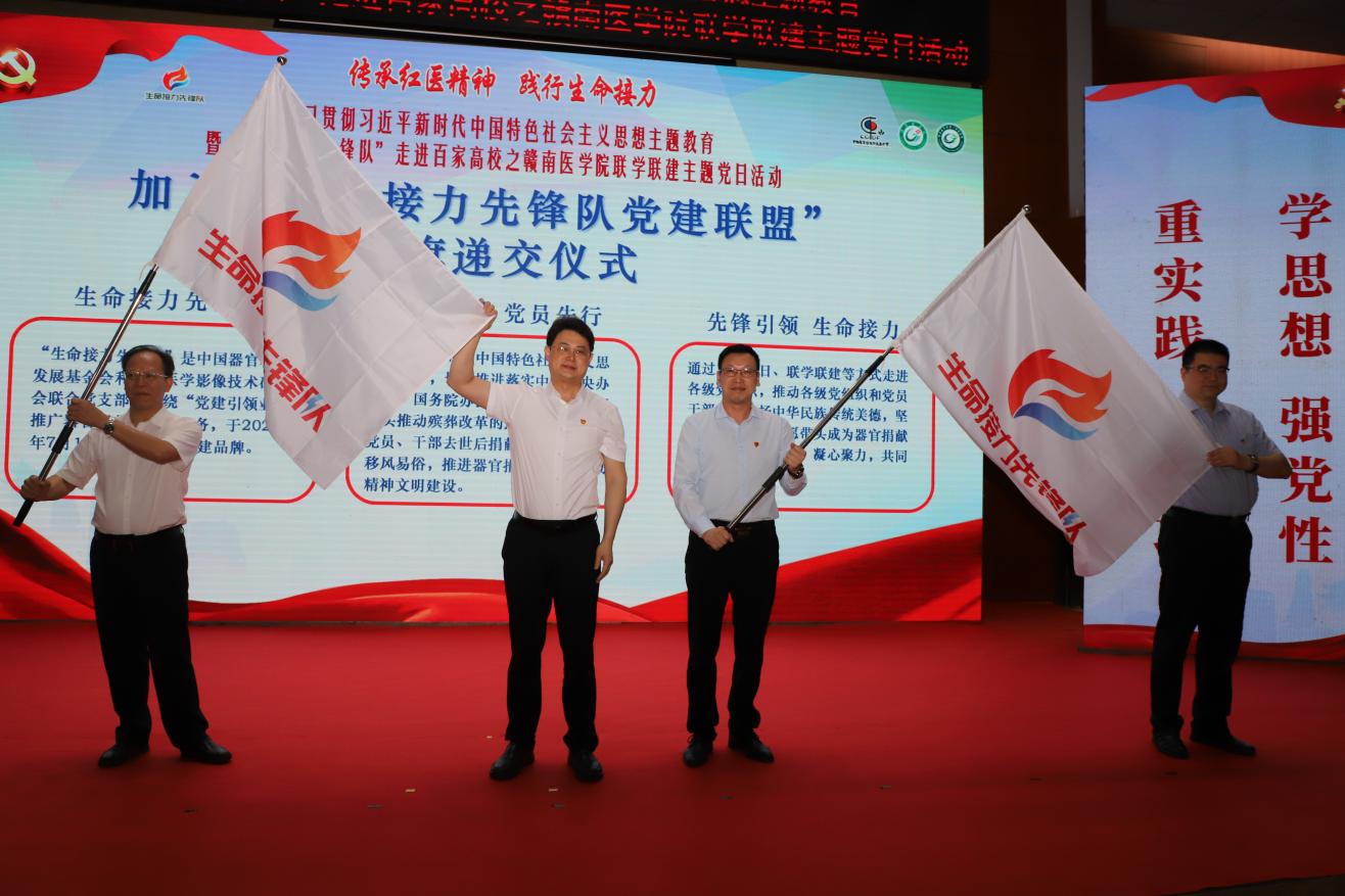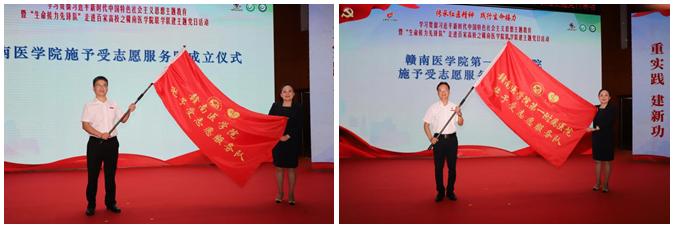 杜冰、赵洪涛向学校及第一附属医院递交生命接力先锋队队旗。