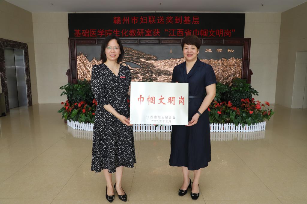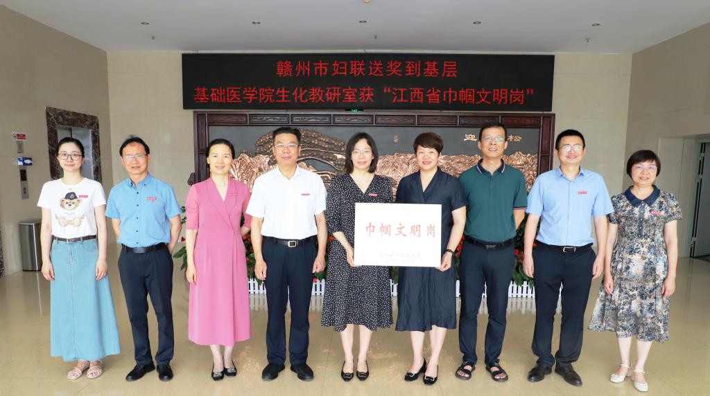 6月8日,赣州市妇联党组成员、副主席刘艳萍向基础医学院生物化学与分子生物学教研室颁发2023年江西省“巾帼文明岗”奖牌。学校党委副书记曾泽鑫出席相关活动。