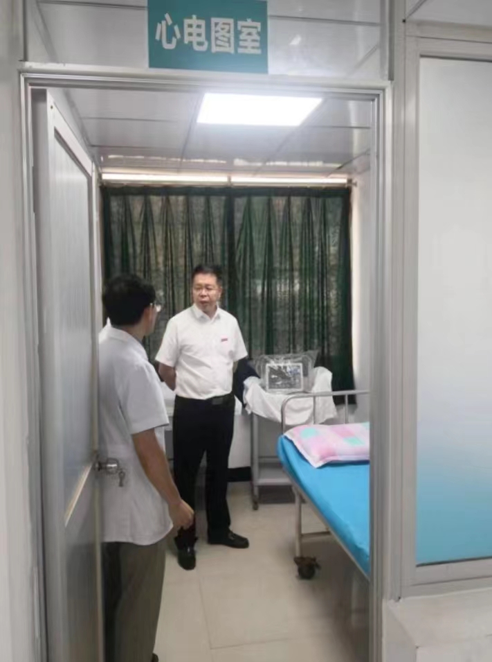 在校医室就诊大厅,廖伟认真询问了学生就医流程、大学生医保的使用以及发热学生的管理等情况。在输液大厅和心电图室,廖伟查看了医疗抢救药品及设备的配备情况,询问了2023级新生体检和军训的医疗保障等工作情况的安排。
