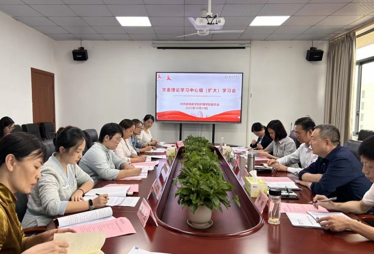 10月19日下午,护理学院开展党委理论中心组学习。该院领导班子全体成员、党支部书记及各科室负责人参加学习,学校党委副书记曾泽鑫到场指导。