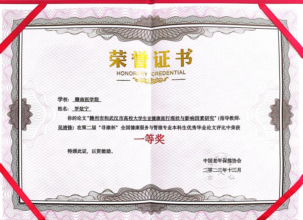 在首届全国本科院校健康服务与管理专业优秀毕业论文评比中,由公共卫生与健康管理学院吴清锋教师指导的罗炫宁同学毕业论文《赣州市和武汉市高校大学生亚健康流行现状与影响因素研究》荣获全国一等奖,李钧、温华斌教师分别指导的宋芯、邹玉如同学毕业论文《赣州市公共卫生服务能力与区域经济耦合度分析》《乡村森林康养旅游游客需求及影响因素研究——以永修县云居山为例》均荣获全国二等奖。