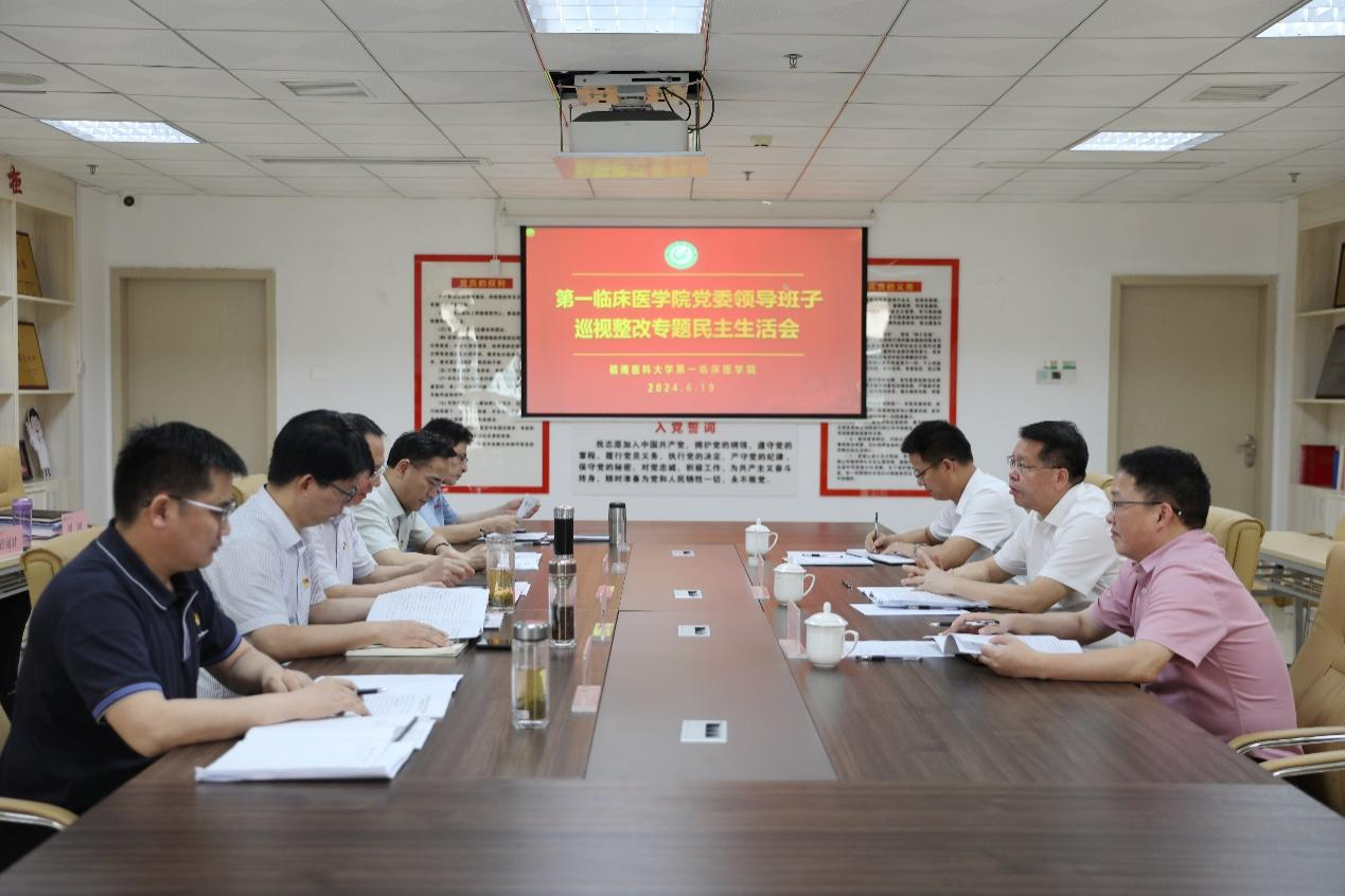 6月19日,第一临床医学院党委召开巡视整改专题民主生活会。学校党委委员、副校长、督导组组长廖伟等到会指导。学校党委委员、副校长,第一临床医学院、第一附属医院党委书记黄瑞忠主持会议并讲话。学院党委领导班子成员参加会议。
