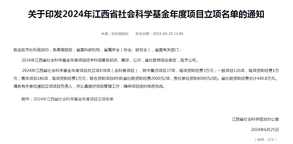近日,江西省社会科学规划办公布了2024年江西省社会科学基金项目评选结果,我校共获批立项6项,其中青年项目3项,一般项目3项。