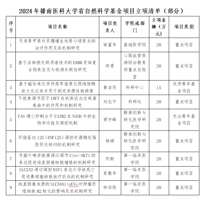 近日,江西省科技厅公布了2024年江西省自然科学基金(第二批)立项项目,我校(含第一附属医院)共有35项省自然科学基金项目获批立项,其中包含重点项目7项、杰出青年基金项目1项、优秀青年基金项目1项、面上项目18项和青年基金项目8项,资助总经费435万,立项数量较2023年提高9.4%,资助总经费较2023年增加20.8%。