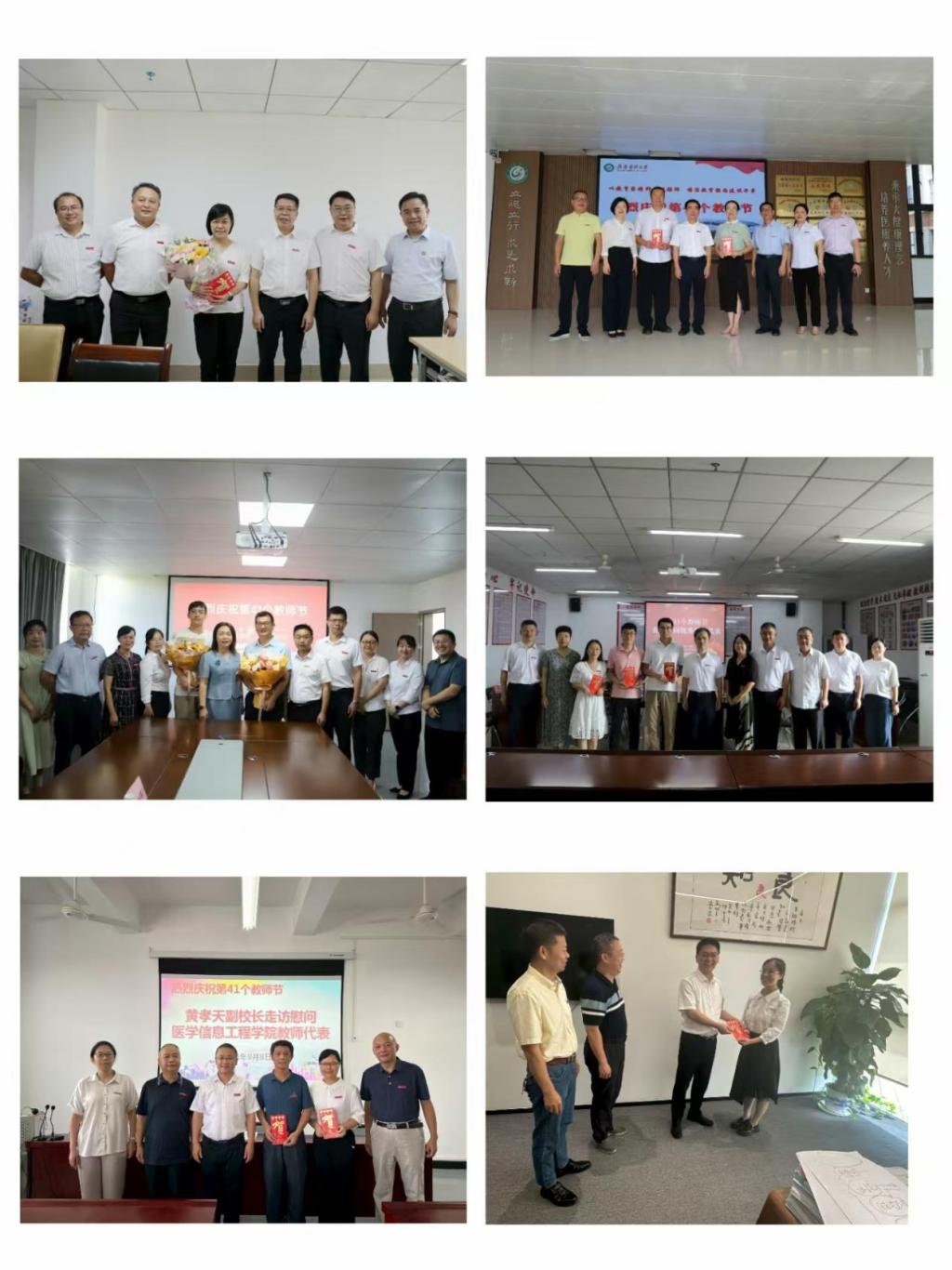 学校党委副书记黄瑞忠走访慰问了人文社会科学学院贺晨、刘莉蓉,第三临床医学院梅冰馨、唐小冬,老年大学彭立嵘,向他们致以教师节的问候,希望他们一如既往做好做优本职工作,为学校高质量发展多做贡献,并祝他们节日快乐、阖家幸福。