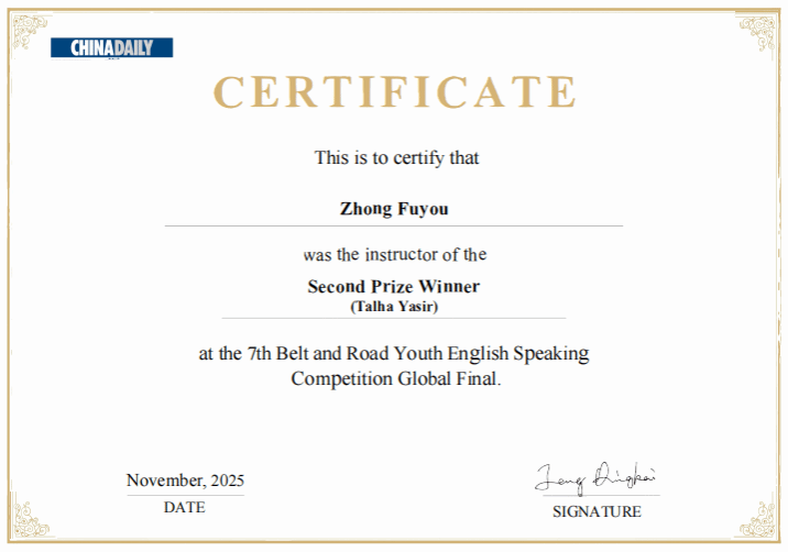 近日,由中国日报社主办的第七届“一带一路”全球青少年英语演讲总决赛在浙江杭州圆满落幕。我校2021级巴基斯坦留学生TALHA YASIR在比赛中发挥出色,凭借扎实的语言功底、深刻的主题阐述与流畅的现场表达,从众多参赛者中脱颖而出,荣获总决赛二等奖。这是他第二次参与此项高水平赛事,并成功卫冕该奖项,展现了我校留学生优秀的综合素养与稳定的竞技水平。