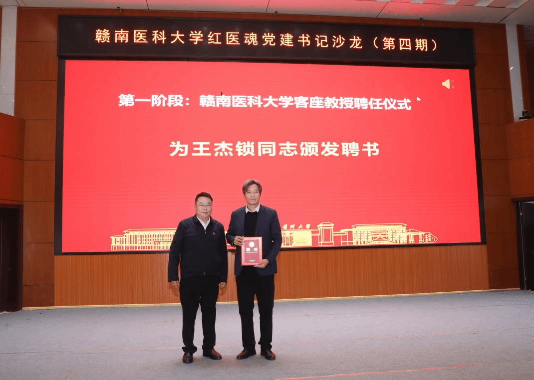 在第一阶段,首先举行了简短的聘任仪式。受学校党委副书记黄瑞忠委托,徐华平为王杰锁教授颁发了赣南医科大学客座教授聘书并致辞。学校将以此次聘任为起点,推动与国家卫生健康委党校在党建共建、理论研究、干部互训、学术交流等领域开展更广泛深入的合作,共同为赣南地区医疗卫生事业进步和健康中国建设注入新动能。