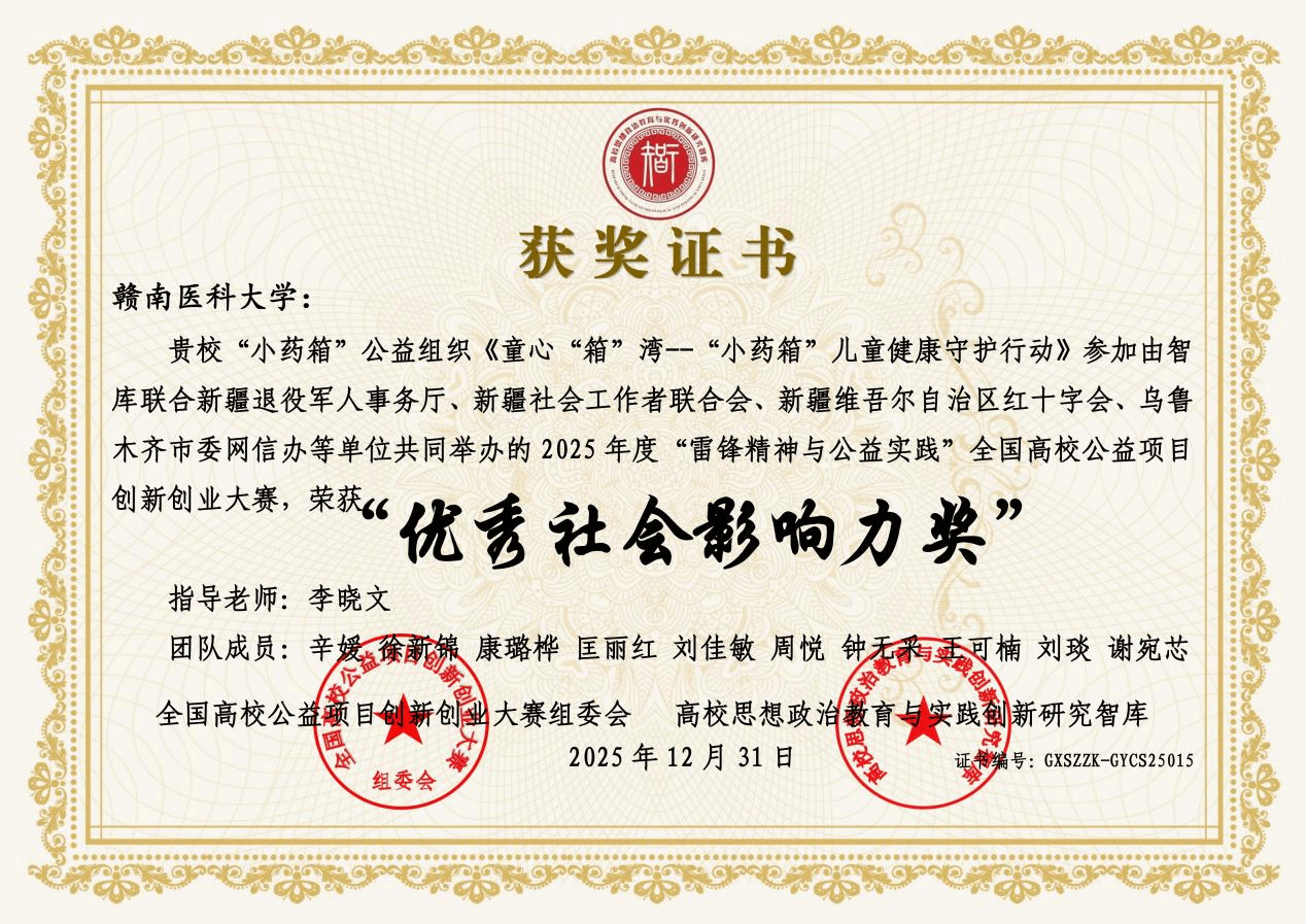 近日,在刚刚落幕的 “雷锋精神与公益实践”全国高校公益项目创新创业大赛中,我校“小药箱”公益团队凭借其创新的服务模式、扎实的实践成果和积极的社会影响,从全国百余个优秀项目中脱颖而出,一举荣获 “卓青公益银奖” 与 “社会影响力优秀奖” 两项殊荣!