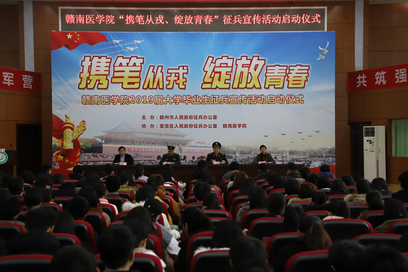 1月5日上午,赣州市征兵办在我校举行2019届大学毕业生“携笔从戎绽放青春”征兵宣传活动启动仪式。学校人民武装部、党委宣传部、校团委负责同志出席,各学院2019届毕业生代表参会。学校人民武装部部长王小敏主持仪式。
