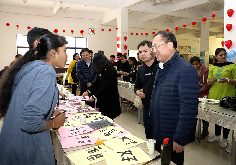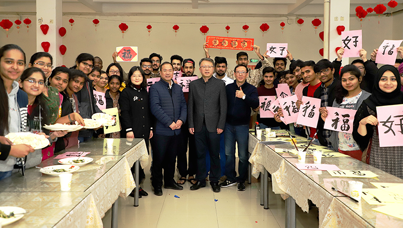 学校副校长刘民、叶军明及有关部门负责人,与全体外籍教师、留学生一起,共同欢度2019年新春佳节。师生们包饺子、写福字,感受浓郁的中国传统文化和喜庆的春节氛围。
