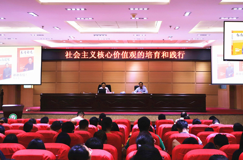 4月29日下午,江西省高校思想政治理论课特聘教授、南昌大学教授、博士生导师陈东有到校作“厚德方能载物--培育和践行社会主义核心价值观”专题辅导。学校党委书记李恭进,党委副书记曾泽鑫,党委委员、副校长叶军明出席,党委宣传部、学工部、团委、研究生处等负责同志,各下属学院党委书记、分管学生工作副书记或副院长,马克思主义学院教师、全体辅导员、学生代表200余人到场聆听。曾泽鑫主持报告会。