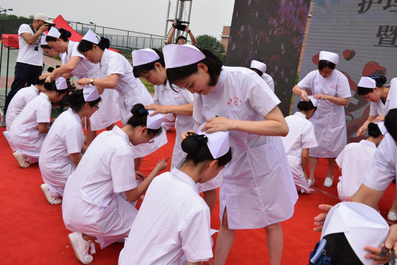 500多名学生身穿洁白的护士服列队来到护理前辈面前,老师们悉心为同学们戴上圣洁的护士帽。这一神圣时刻,不仅标志着护生成为了一名准白衣天使,也标志着他们肩负起了护理事业神圣而光荣的使命。