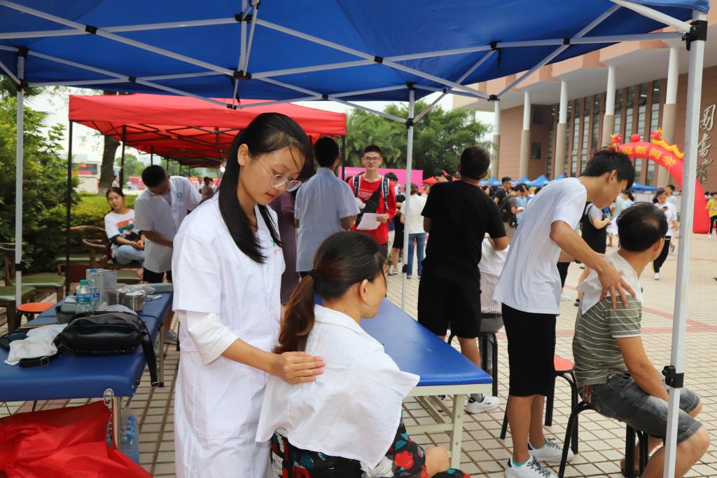 报名点旁,推拿中医药协会和针灸协会的同学们手上一刻也没闲着,接受推拿服务的家长络绎不绝,家长们对这样的特色迎新交口称赞。
