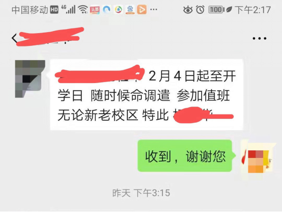 “2月4日起至开学,随时候命调遣。”“我身体无恙,家庭无后顾之忧,可以每天值班。”“2月9日之后,我也可以增加值班。”“增加值班,那必须有我,这是我的职责。”面对严峻疫情形势,学校决定强化值班值守,加强两个校区门岗监督、校园巡逻以及应急处理等疫情防控工作。通知发出不到一个小时,60多名中层干部主动报名要求参加值班值守。“原以为在这个特殊时期,会比较少的人自愿加班,没想到全体在家的中层干部非常积极,有的夫妻双双主动请缨,不计报酬加班。”学校新型冠状病毒感染的肺炎疫情防控工作领导小组负责人表示。