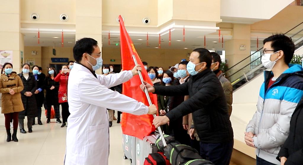 刘潜为支援湖北医疗队授旗,陈懿建代表医疗队接受队旗。