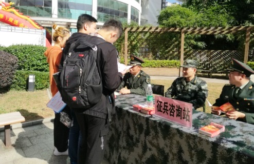 此次宣传活动恰逢我校2021届毕业生双选会,市、区征兵办在校园悬挂醒目的征兵宣传标语,设立征兵咨询站,发放征兵宣传单,吸引了众多同学和家长前来咨询,征兵办同志现场向介绍大学生征兵政策和优惠措施,提高了大学生国防观念和投笔从戎、献身国防的参军热情。