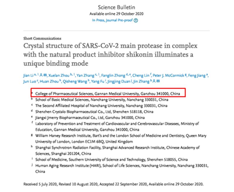 10月29日,药学院李健博士联合南昌大学张进博士在Science Bulletin (影响因子:9.5,一区)上在线发表了题为“Crystal structure of SARS-CoV-2 main protease in complex with the natural product inhibitor shikonin illuminates a unique binding mode”的论文.