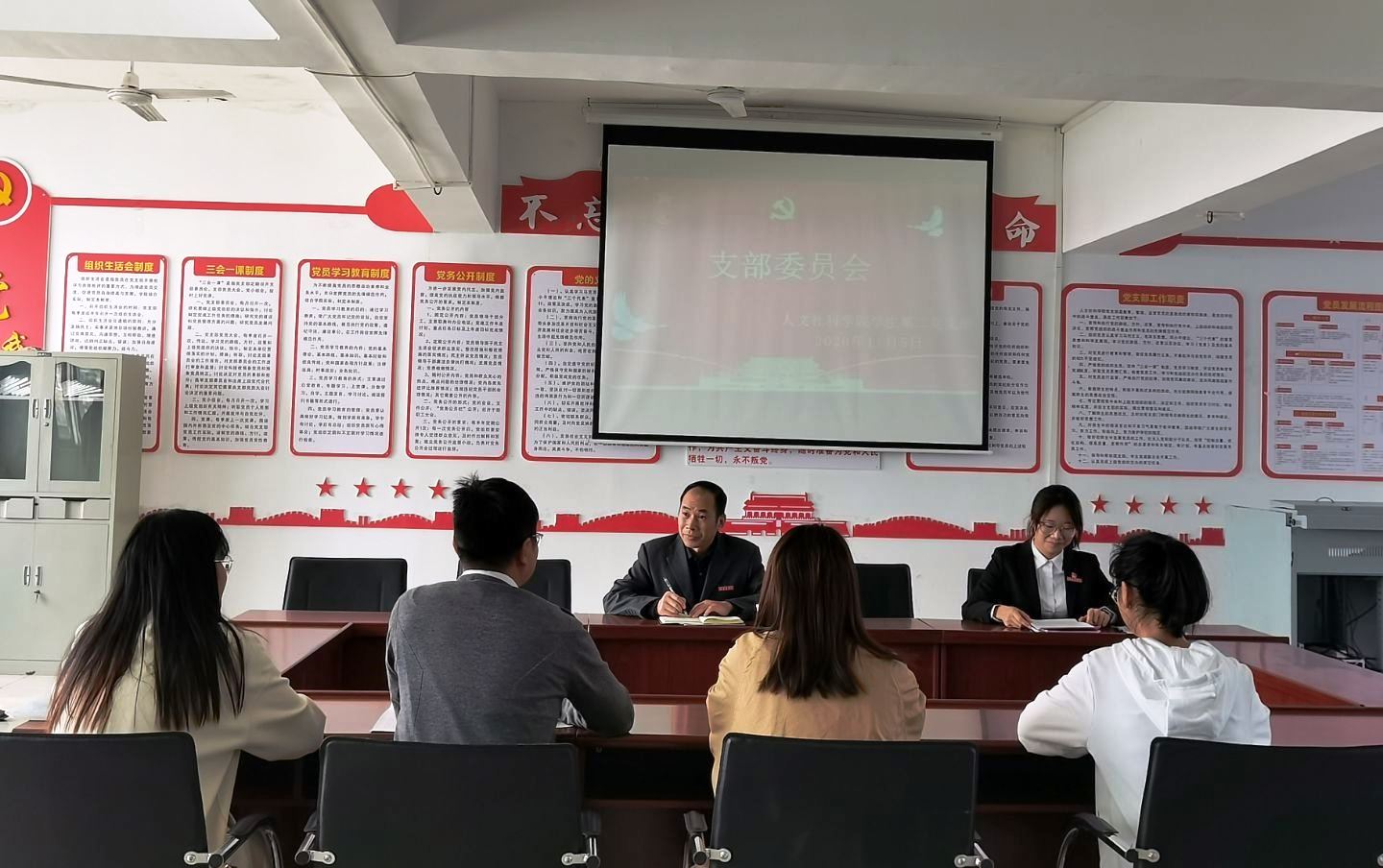 11月5日,人文社科学院学生第二党支部在黄金校区党员活动室召开支委会,学习贯彻党的十九届五中全会精神。学校党委委员、统战部长赖传景到该党支部调研并列席支委会。