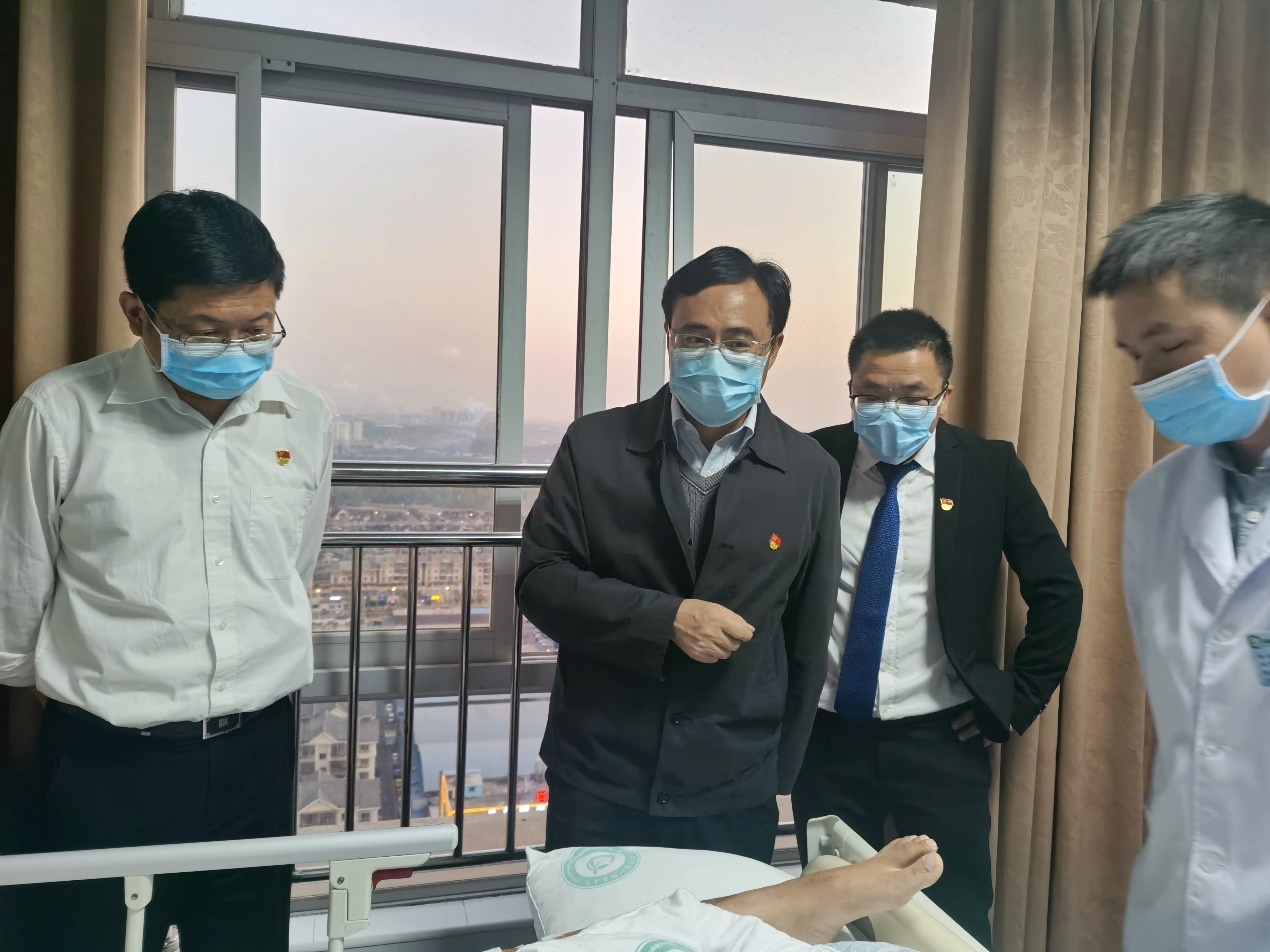 11月5日下午,我校党委副书记、校长刘潜代表学校专程来到一附院再次看望因公受伤民警张毅,党委委员、副校长兼一附院党委书记张小康陪同看望。