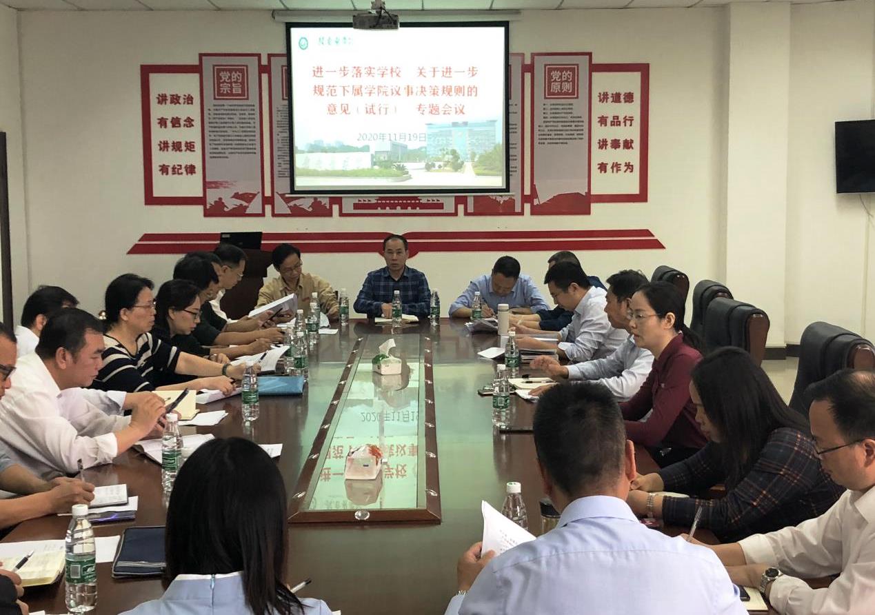 11月19日上午,我校召开进一步落实《关于进一步规范下属学院议事决策规则的意见(试行)》专题会议。学校党委副书记曾泽鑫出席讲话,学校党委委员、党委组织部部长甘雅芬主持会议,各下属党委(党总支)书记及其行政主要负责人参会。